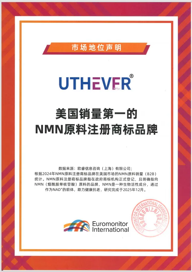 近日,全球独立研究机构欧睿国际(Euromonitor International)的调研结果确认,音芙旗下原料品牌Uthever® NMN 为“美国销量第一的NMN原料注册商标品牌”*。该结论基于其对2024年美国市场NMN原料注册商标品牌B2B销量的严谨统计与研究,是来自权威第三方的客观市场验证。而对音芙而言,这份经过严谨调研论证的“市场第一”,恰恰是对我们长期奉行“科研长期主义”路径的有力呼应。