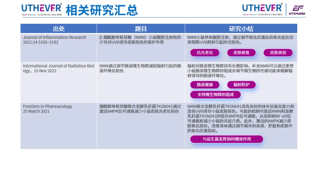 市场的认可是结果,多维度的科学实证是根本。围绕Uthever® NMN,一系列发表于《Free Radical Biology and Medicine》、《Cell Discovery》等国际期刊的研究,已构建起一个覆盖皮肤健康、肠道防护、DNA修复、免疫调节及人体代谢的完整证据网络: