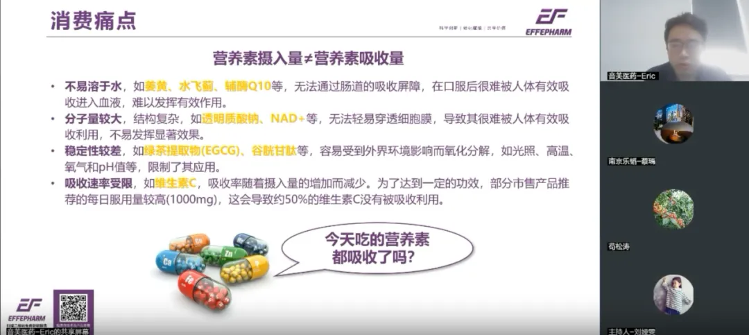 3月10日,由音芙医药主办的“未来营养创新论坛”系列直播圆满落幕。本次直播以 “临床科研实证:脂质体增效技术赋能维矿及护肝产品升级” 为主题,由我司产品部负责人 Eric Jing 倾情分享,深入剖析了脂质体技术在解决营养素吸收难题上的核心优势与最新应用成果。直播期间,观看人数持续攀升,互动区讨论热烈,我们收到了许多关于技术细节与市场应用的深度提问。